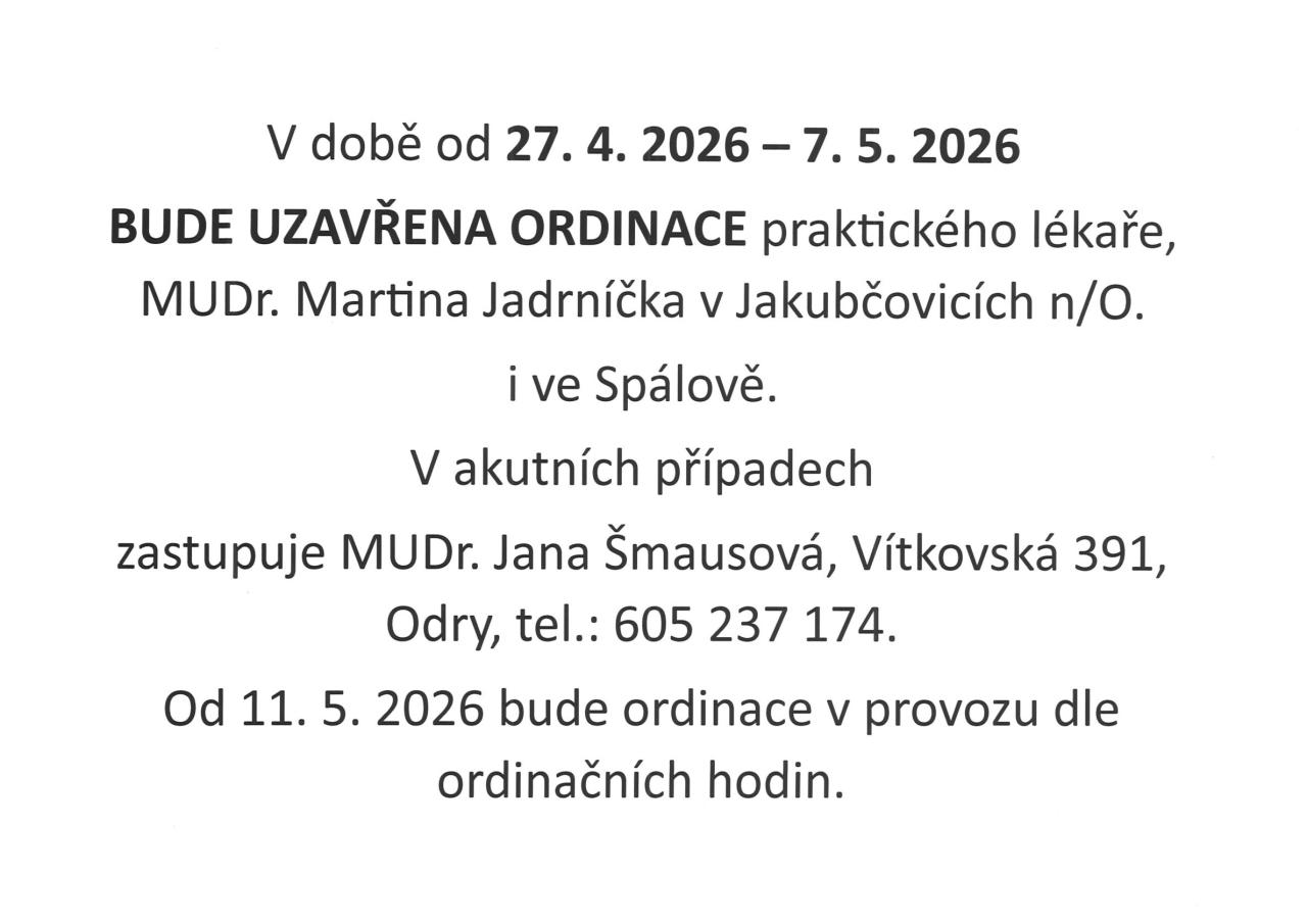 MUDr. Martin Jadrníček informuje o uzavření ordinace v době od 27. 4.-7. 5. 2026.