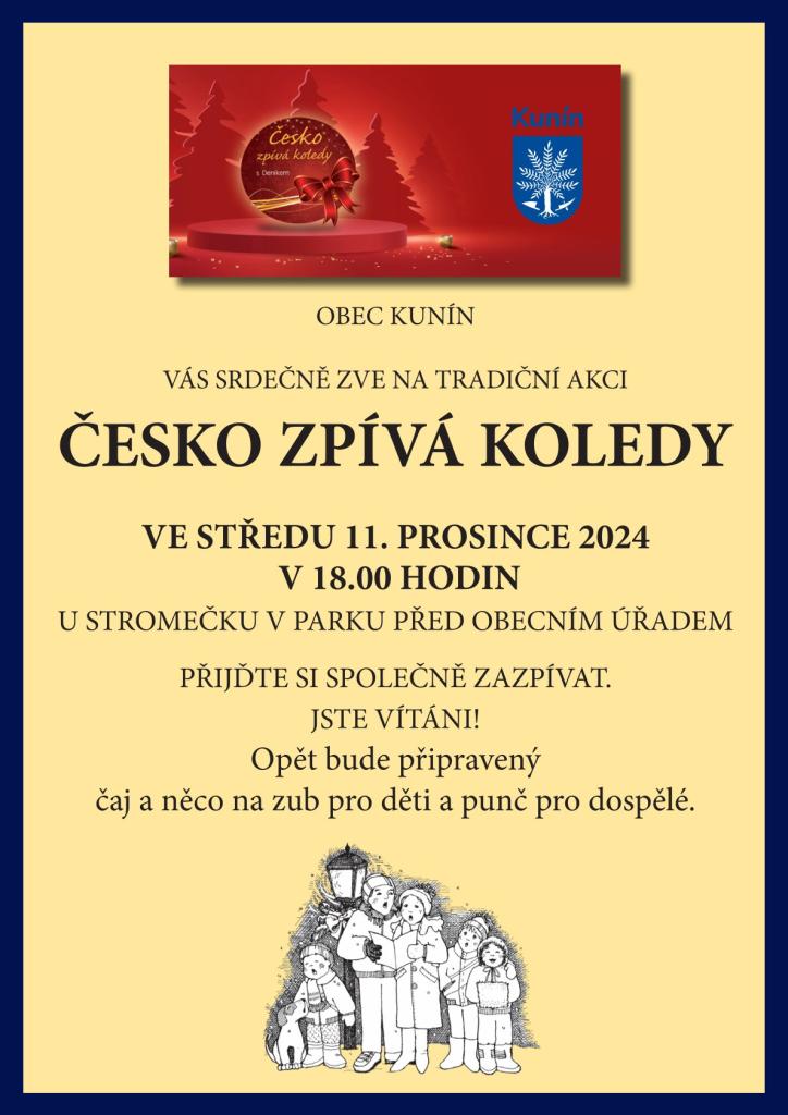 Obec Kunín Vás srdečně zve na tradiční akci Česko zpívá koledy, která se uskuteční ve středu 11. prosince 2024 v 18:00 hodin u stromečku v parku před obecním úřadem. Přijďte si společně zazpívat - jste vítáni! Opět bude připravený čaj a něco na zub pro děti a punč pro dospělé.