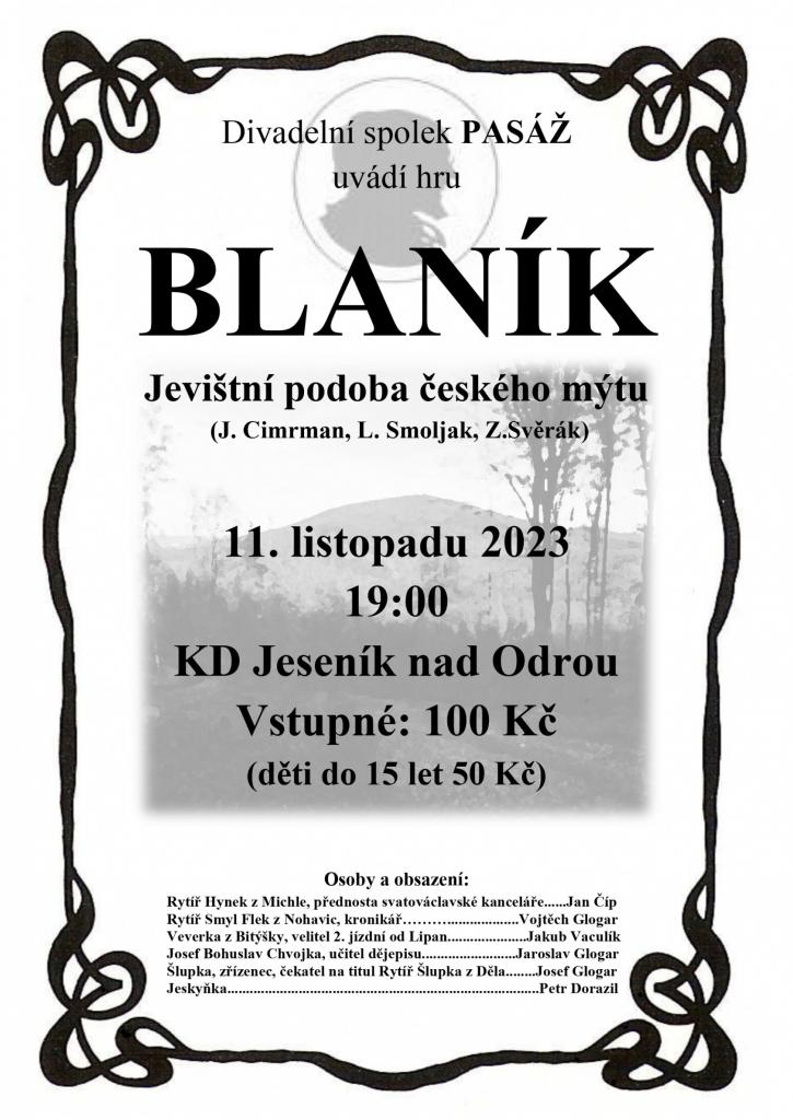 Divadelní spolek PASÁŽ uvede hru Blaník. 11. 11. 2023 v 19 h. v KD Jeseník nad Odrou.